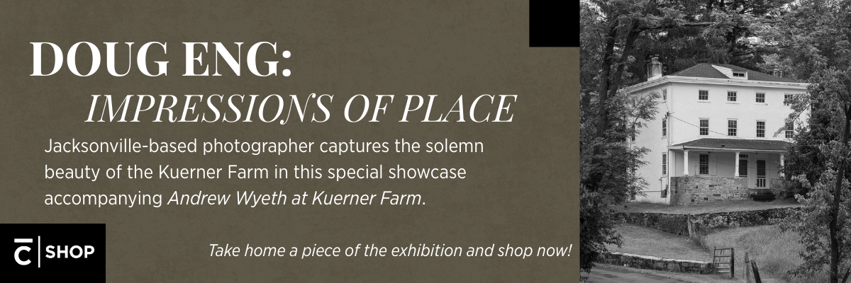 Impressions of Place complements Andrew Wyeth at Kuerner Farm: The Eye of the Earth by capturing the 33-acre Kuerner Farm in Chadds Ford, Pennsylvania, largely preserved as Wyeth would have seen it. Eng’s photographs, from wide landscapes to intimate details, show the roads, buildings, fields, and hills that inspired Wyeth.