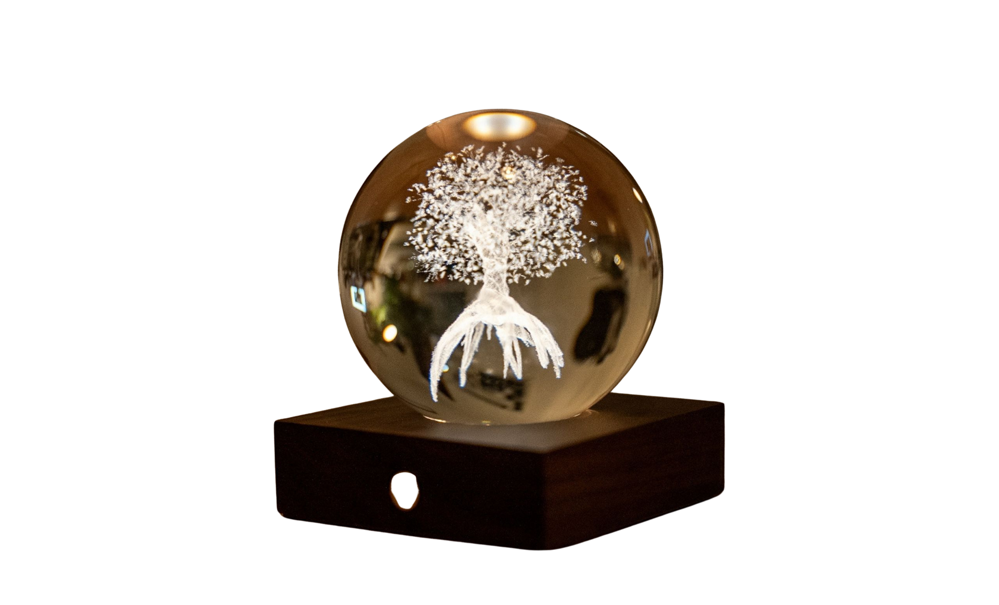 At 4.7 inches tall, the crystal globe sits atop a natural walnut wood base, perfectly complementing any interior. With a simple touch of the copper button on the front, you can switch between three light intensity levels to suit your mood. The polished crystal reflects light beautifully, creating a captivating effect in any room. Equipped with a rechargeable battery, the lamp provides up to 16 hours of continuous illumination, and the USB-C port in the back allows for easy charging.