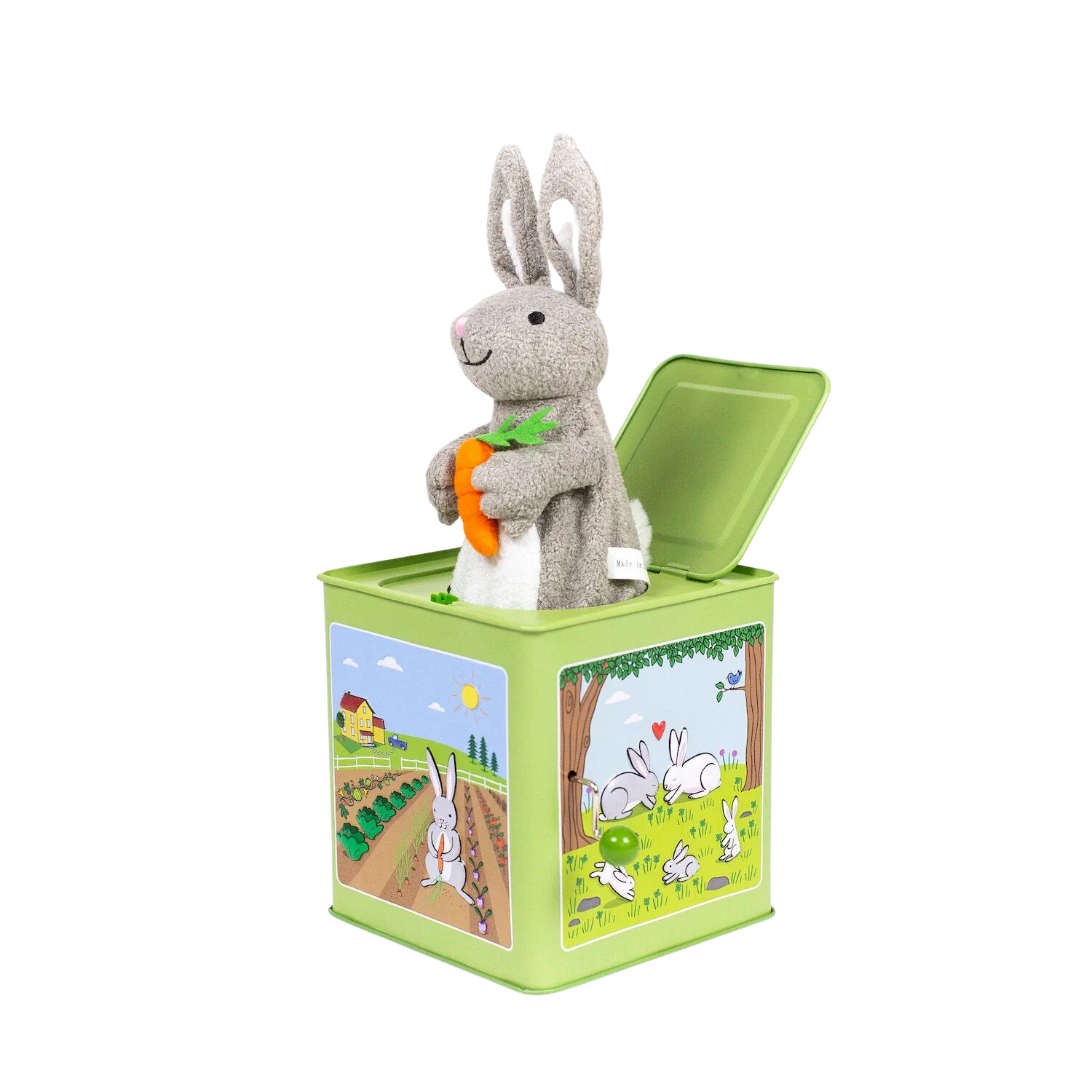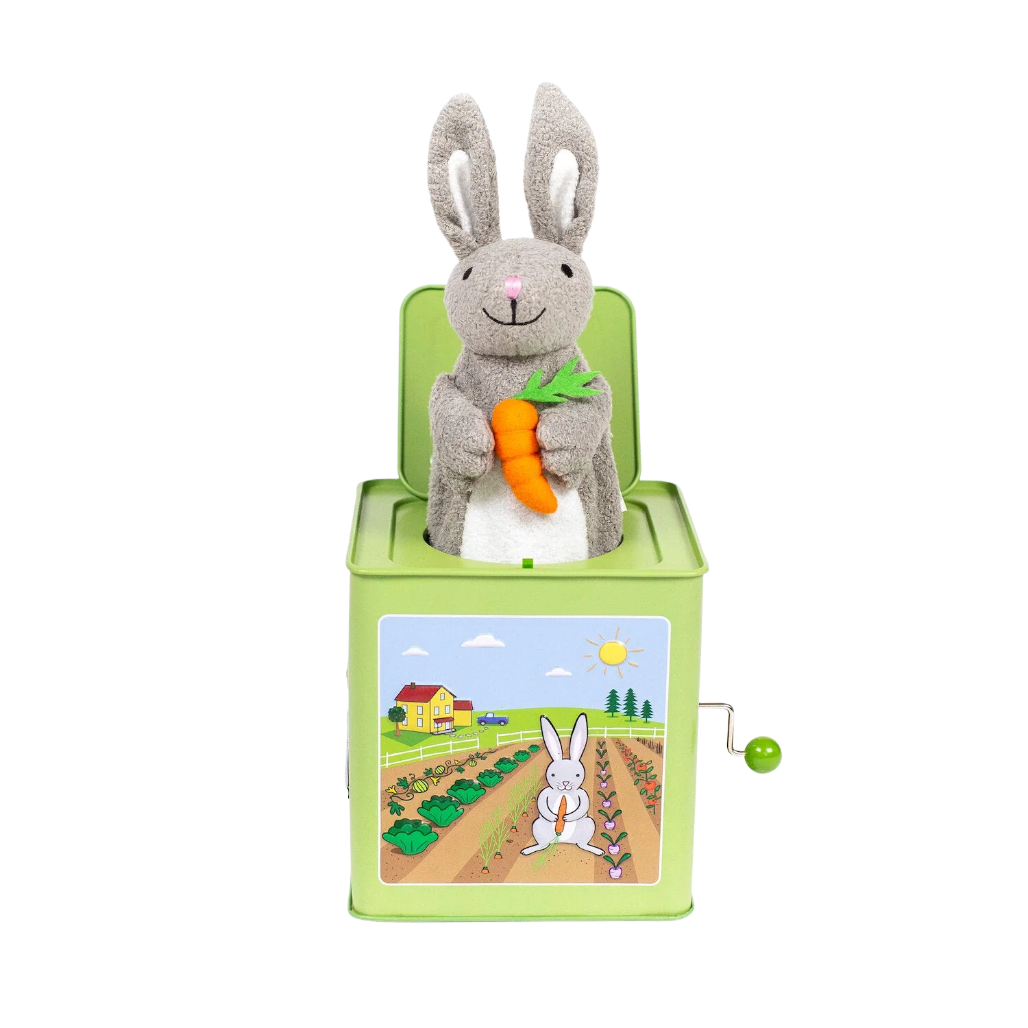 Jack-in-the-Boxes have been a time-honored favorite toy since the 1500’s! Jack Rabbit Creations creates a twist on this classic, with all original art, cuddly plush characters, and unique play-along songs. Surprise your youngsters with this Bunny Jack in the Box that plays “Here Comes Peter Cottontail”.