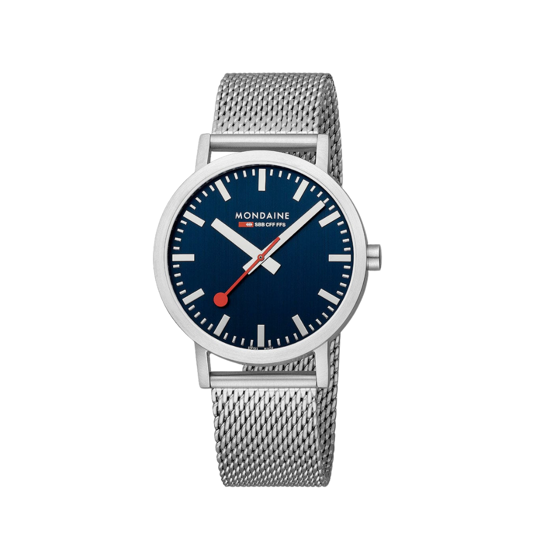 This Classic collection watch showcases a 40mm tone-on-tone stainless steel case, hands and markers with a matte finish to maintain the timeless design and minimalistic look of Mondaine. Featuring a Deep Ocean Blue dial and a stainless steel Milanese mesh band, this timepiece pays tribute to the wonders of our seas. Our Classic Collection comes with a clever quick-change system, allowing you to easily change your straps.