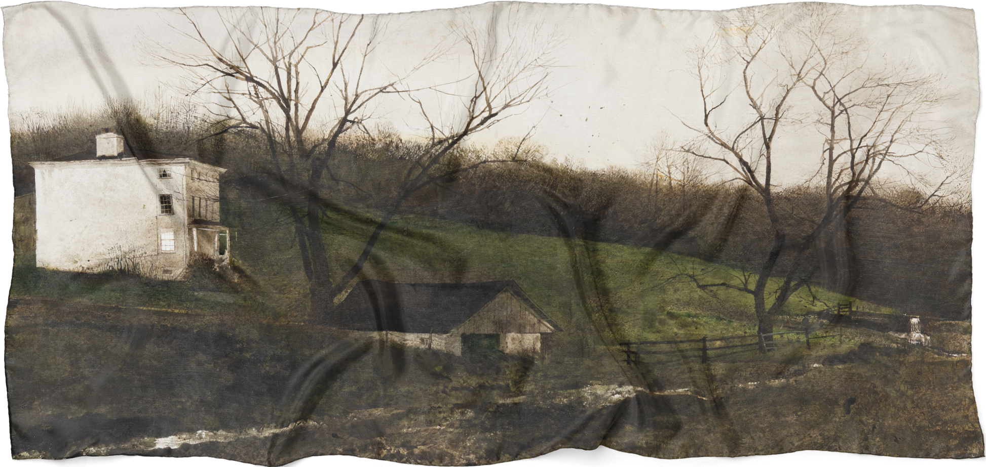 Wrap yourself in American art history with this elegant scarf featuring Evening at Kuerners by Andrew Wyeth. Designed exclusively for the exhibition Andrew Wyeth at Kuerner Farm: The Eye of the Earth, the scarf captures the quiet beauty and emotional depth of Wyeth’s iconic drybrush watercolor painting.