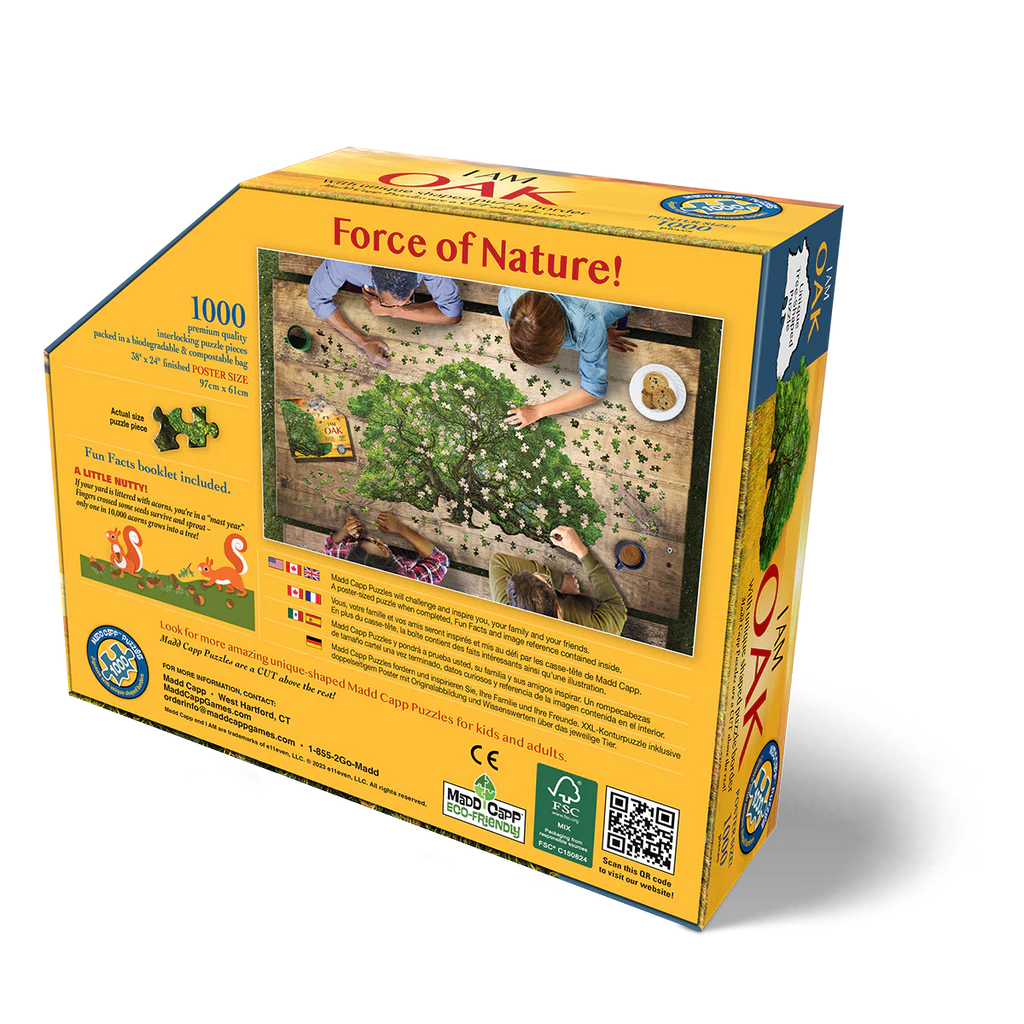 Force of Nature! Unique-shaped 1000-piece jigsaw puzzle for ages 12 and up. Each puzzle comes with an educational Madd Capp Fun Facts booklet. On one side is a fold-out puzzle image to hang as a poster or use as a reference. The flipside is chock-full of cool information! Did you know, for instance, that if your yard is littered with acorns, you're in a "mast year?" Fingers crossed some seeds survive and sprout – only one in 10,000 acorns grows into a tree!