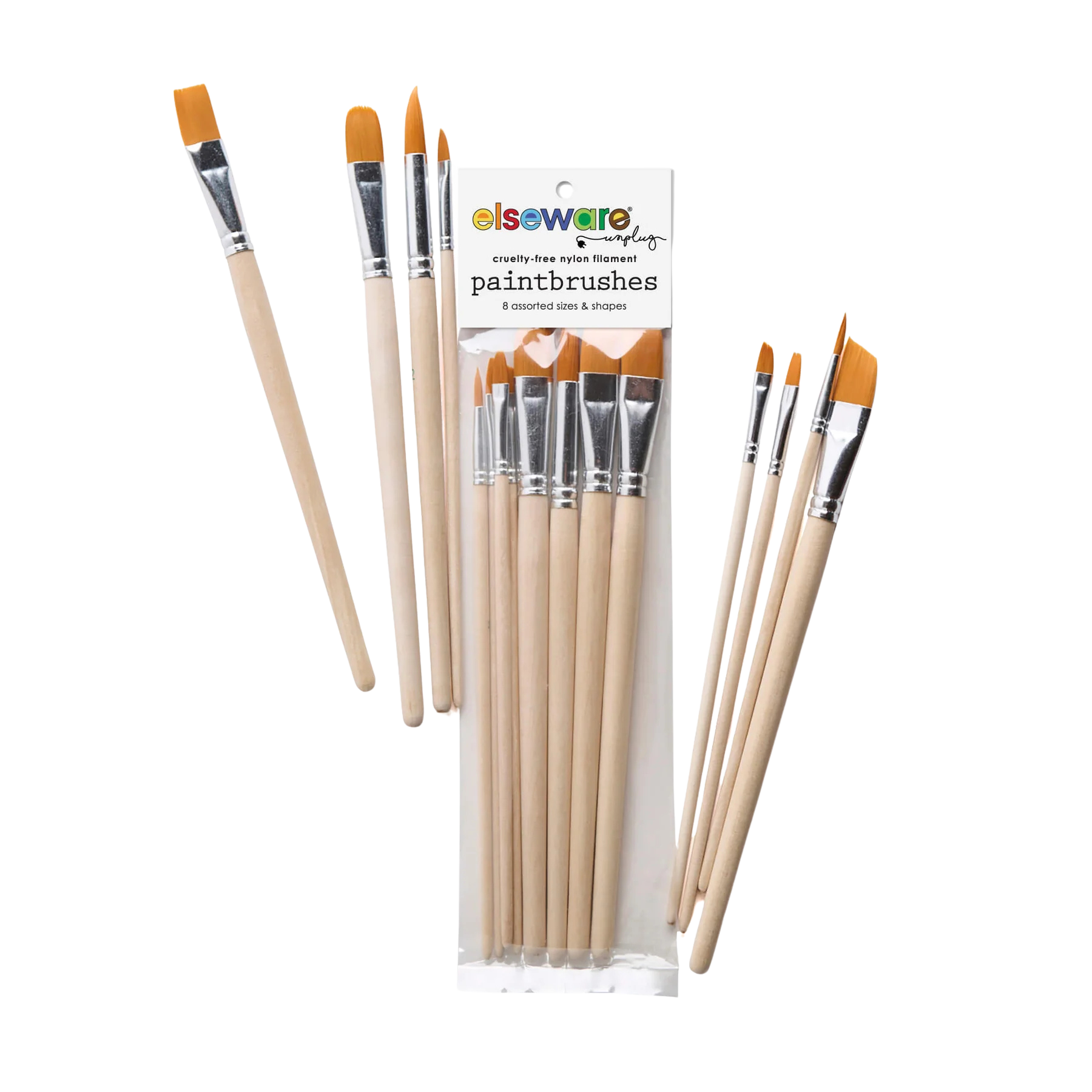 Create your next masterpiece with this versatile Paintbrush Set of 8 by Elsewhere Unplug. The cruelty-free nylon filament brushes include large and small flat, angled, and round shapes, making them ideal for water-based paints such as tempera, acrylic, and watercolor.