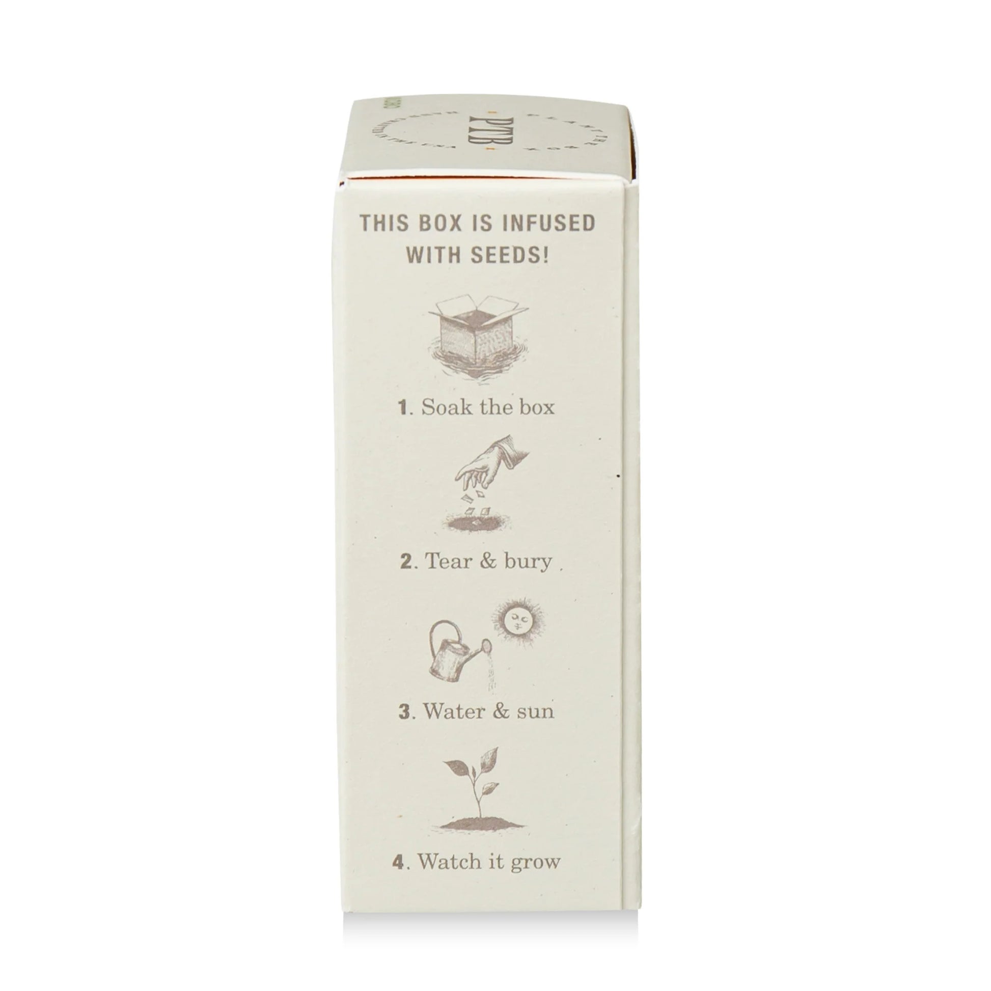 Green melon and pink jasmine, cyclamen, and lily drifts through the evening air, with white musk as an elegant finish. Plant the box and the seed-infused package will grow sunflowers and other wildflowers.