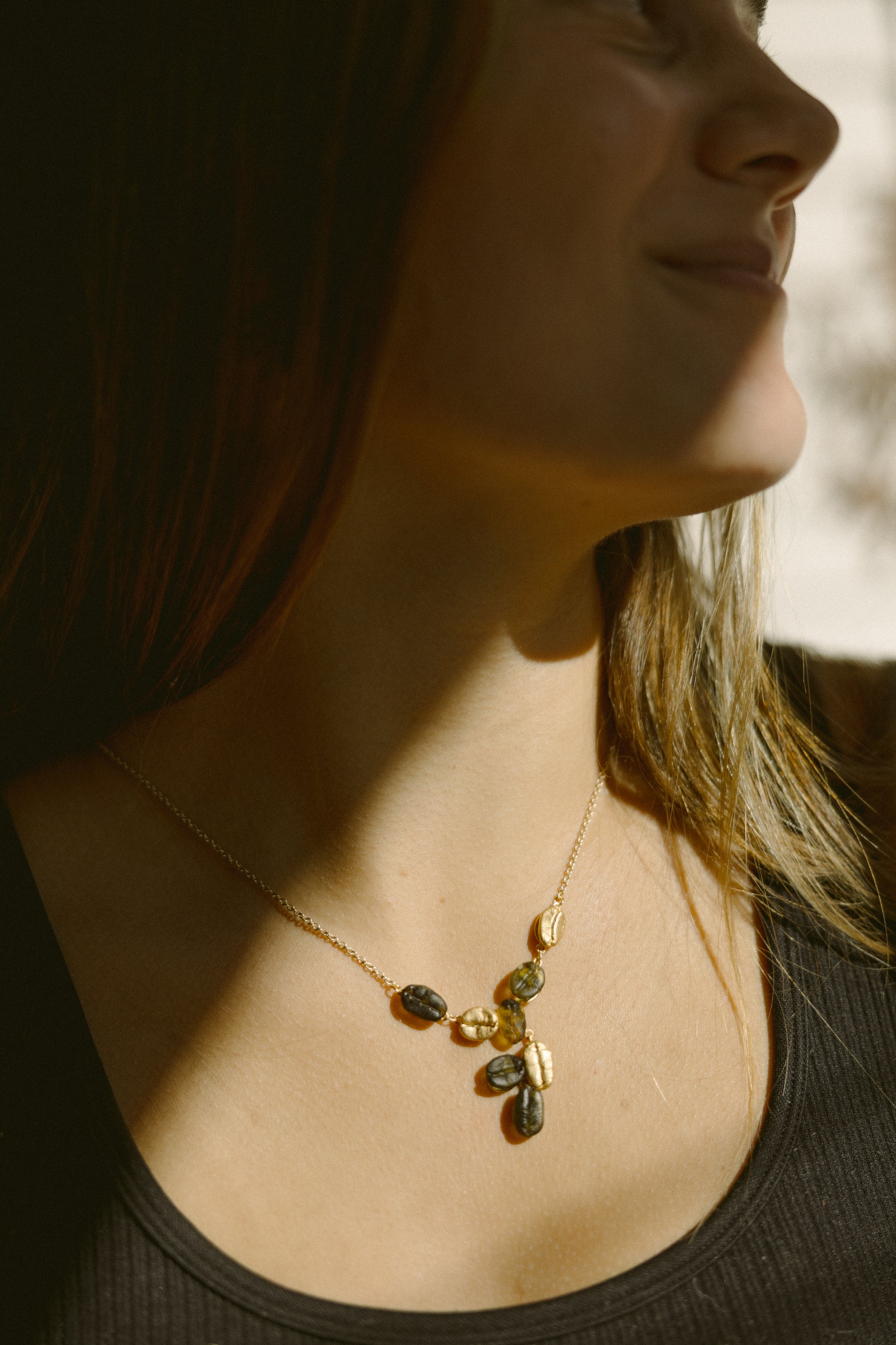 The necklace measures approximately 16” and includes an adjustable clasp (1.5–2”) for a comfortable fit—whether worn close to the neck or a bit looser for a relaxed look. Perfect as a gift for coffee enthusiasts or a unique addition to your own jewelry collection, this pendant blends natural inspiration with fine artistry.