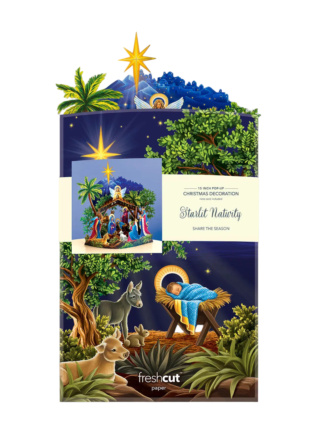 O Come Let Us Adore this beautiful Christmas celebration! A traditional manger comes to life in this pop-up nativity scene with gold foil detailing. Lush olive trees and palms bloom against Bethlehem’s glowing night sky, serving as a beautiful backdrop for the nativity featuring Mary, Joseph, the Wise Men, and baby Jesus, all gathered under a bold and bright Christmas star. Doubling as decor and a gift, FreshCut Paper’s Nativity Scene is perfect for your holiday mantel or as the centerpiece of your Christmas dinner: this decorative display adds Christmas cheer to all holiday celebrations.