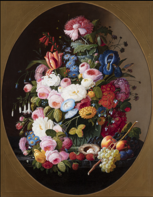 - Image: Still Life with Flowers, Fruit, and Bird’s Nest by Severin Roesen (c. 1865)