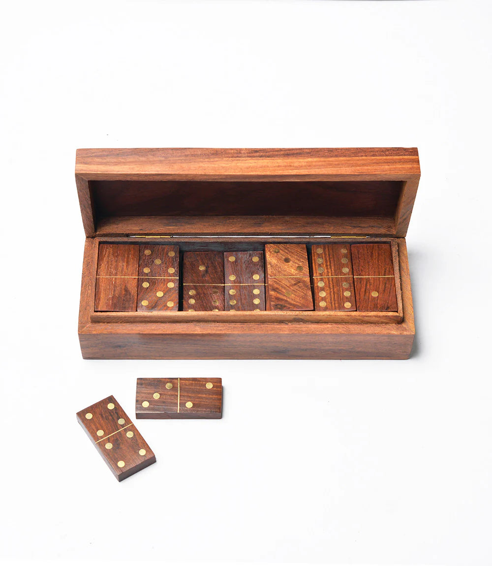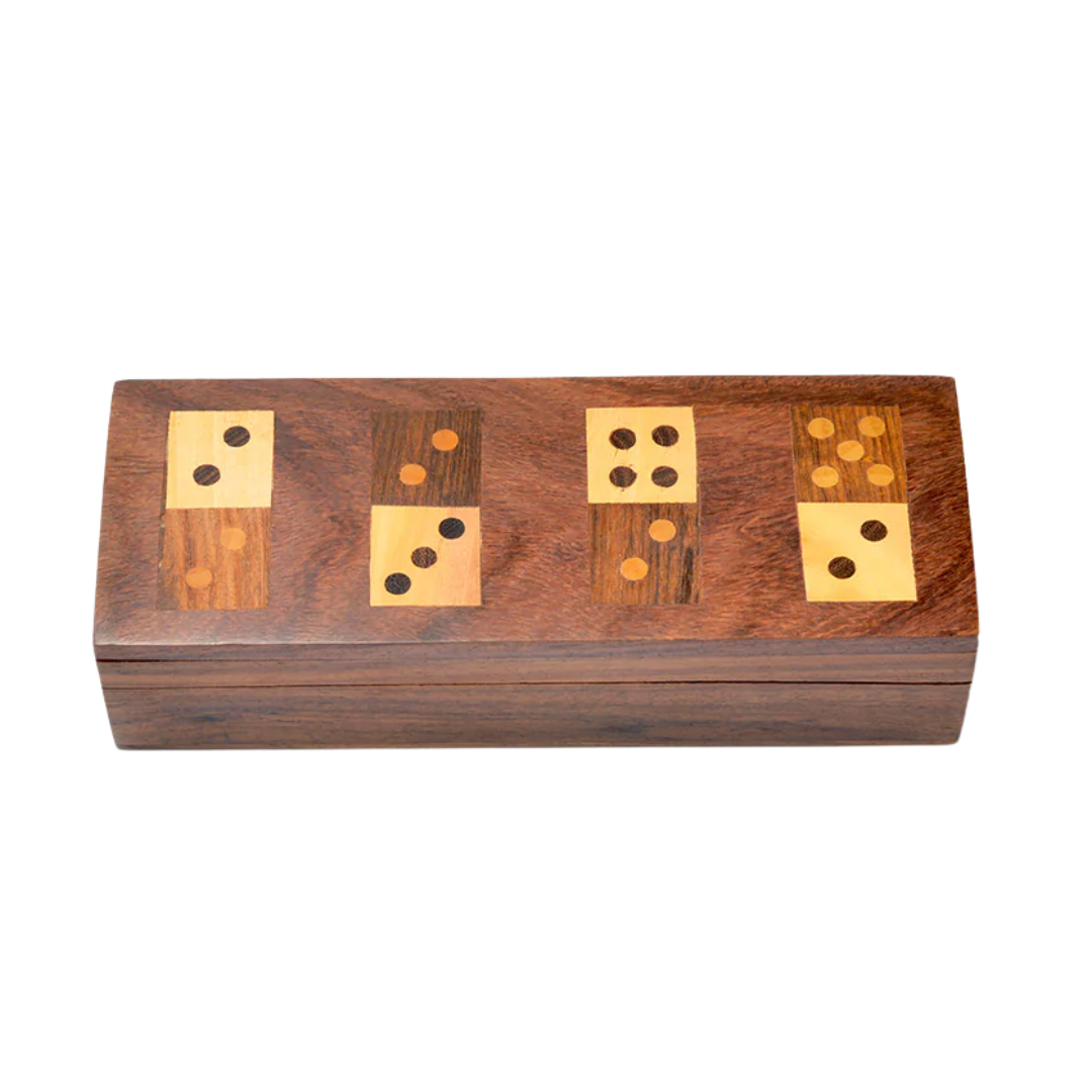 Enjoy hours of game night fun and entertaining with this elegantly boxed domino set with 28 bones. Made from Indian rosewood, a sustainably sourced wood from India. Gold brass inlays complete the elegant look. Great gift for Dad, brother or friend or to play and add to your home decor, coffee table or desk.